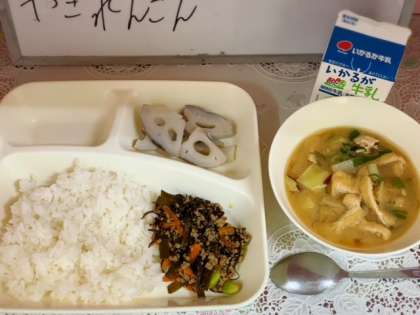 さつまいも・鶏肉・うすあげ・はくさい・たまねぎ・青ねぎを具材にした、栄養満点の汁物でした。