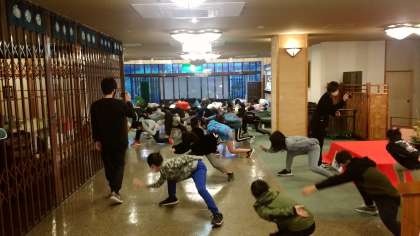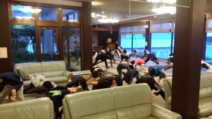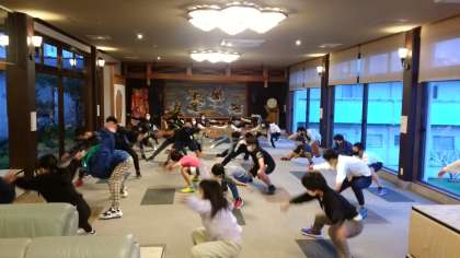身体を目覚めさせるために体操をします。ラジオ体操と思いきや、ソーラン節でお目覚めです。