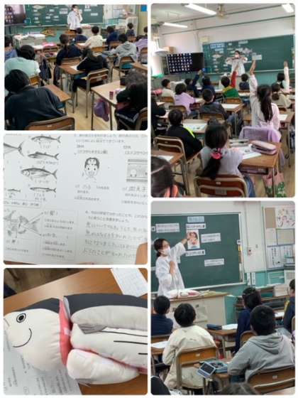 また、かつおの縞(しま)模様は、釣り上げられた時やメスを追いかけている時など興奮状態になると縦縞から横縞になることも教えていただき、子どもたちはとても楽しそうに授業に取り組んでいました。