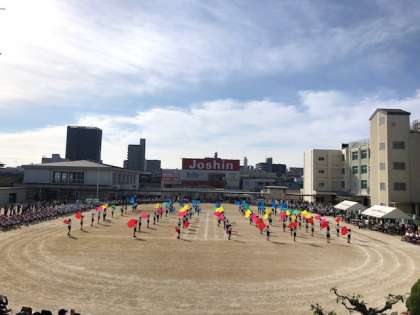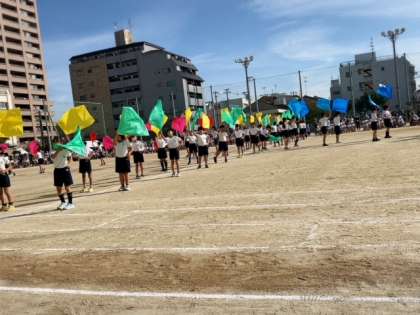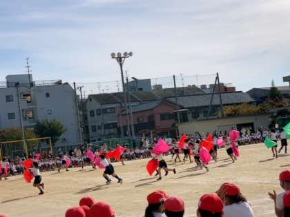4年生は色とりどりのカラー袋を旗に見立てて元気いっぱい演技しました!演技途中、袋に空気を入れて膨らませたりと扱うのが難しかったようですが、みんな息ピッタリの演技を披露してくれました!