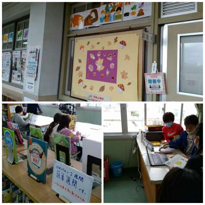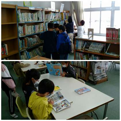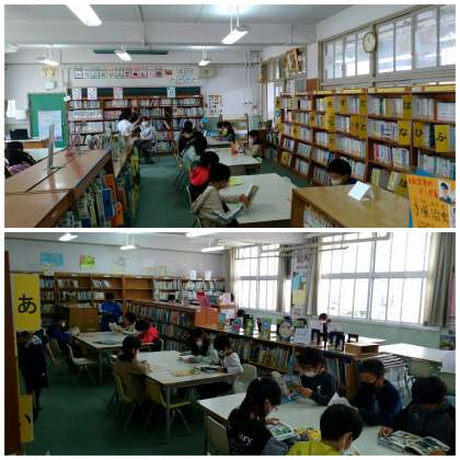 4年生の図書の時間の様子です。自分たちで貸し借りの手続きをして、静かに読書に取り組んでいました。図書室は週1回、学校図書館補助員の方が来て、おすすめの本や新しく入った本などの紹介や子どもたちが少しでも読書に興味をもってもらえるような工夫を図書室にしてもらっています。