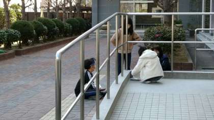 4年生が、理科の学習をしている様子です。冷やしたビーカーにつく水滴は何かという実験です。子どもたちは、日向へ行ったり日陰にいったりといろいろな場所でビーカーにつく水滴を観察していました。