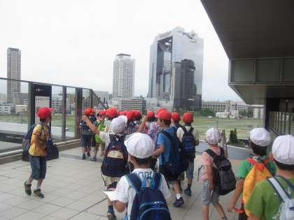 空中庭園ではあべのハルカスや大阪城を見つけたり、淀川や大きな橋、大阪国際空港を発着する飛行機をおいかけたりとても意欲的に見学しました。
