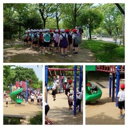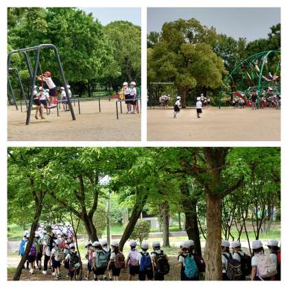 1年生が小学校で初めての遠足に行きました。行先は鶴見緑地公園です。行きも帰りもしっかりと並んで歩くことができ、公園では、めいっぱい遊ぶことができました。楽しむときは楽しむ、ルールを守るときは守るととてもがんばった遠足でした。