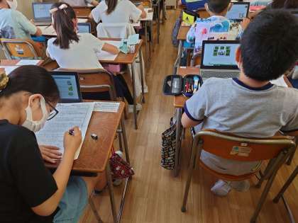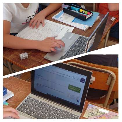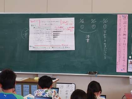 6年生の国語科の学習の様子です。自分たちで調べたことをまとめ、防災ポスターを作る学習です。自分たちで調べた内容を効果的にまとめ、活用していくところが大切なポイントになっています。