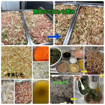 「豚肉のごまみそ焼き」は、豚肉にねりごまを使った調味液で下味をつけ、たまねぎとピーマンを加えて混ぜ合わせいりごまをふり焼き物機で焼いています。