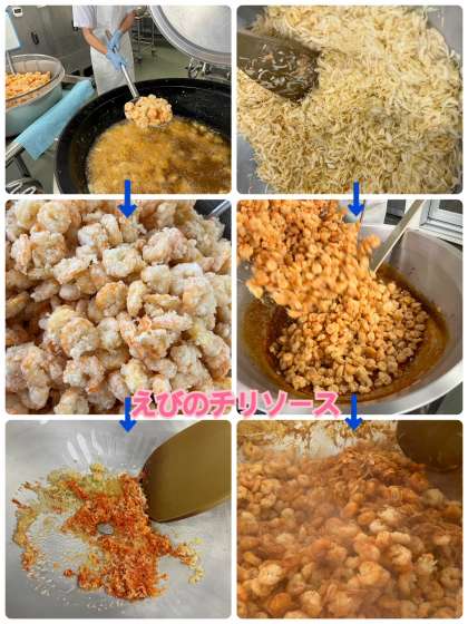 「えびのチリソース」は、塩・こしょう・料理酒で下味をつけたえびにでんぷんをつけて揚げ、しょうが・にんにく・トウバンジャン・砂糖・こいくちしょうゆ・ケチャップを合わせて作った少し辛みのきいたソースをからませています。