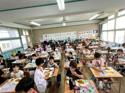 牛・豚ひき肉を使い、小麦粉と綿実油を合わせて作る給食室手作りのブラウンルウで仕上げた、児童に大変人気のある献立です。