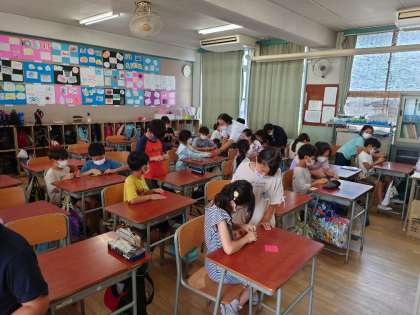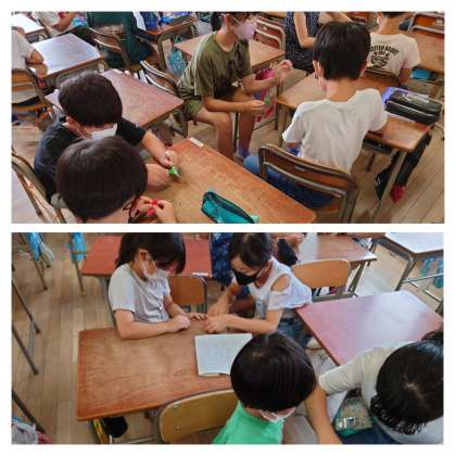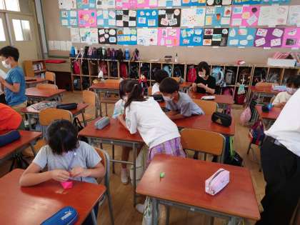 新森小路小学校では、平和学習の取り組みのひとつとして、全校児童で千羽鶴を折っています。今日は5年生が2年生に鶴の折り方を教えていました。