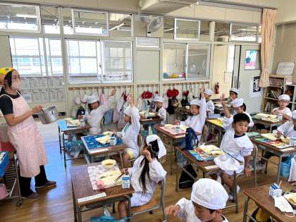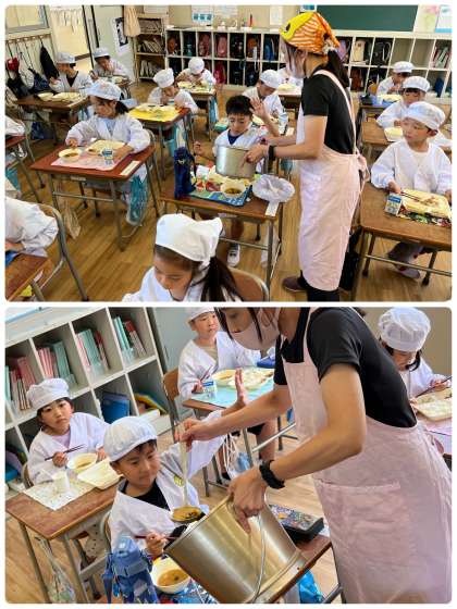 1年生の教室。先生が「おかわりしたい人!」と言うと、たくさんの手が挙がっていました♪1学期と比べると食べるスピードが早くなって、時間内に完食できる子がずいぶん増えました^^
