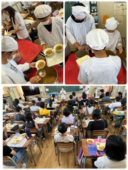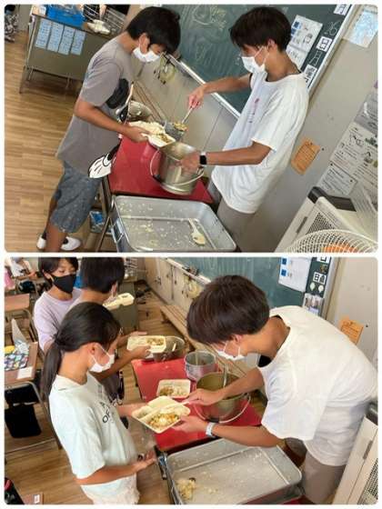 卵アレルギーの児童の分は、卵を流し入れる直前のものを取り分け専用の容器に入れて提供しました。
