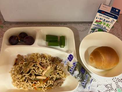 豚肉・いかを主材にしてキャベツ・たまねぎ・ピーマン・にんじんを使用した、定番のソース味の焼きそばでした。きざみのりをかけることで風味を増しています。