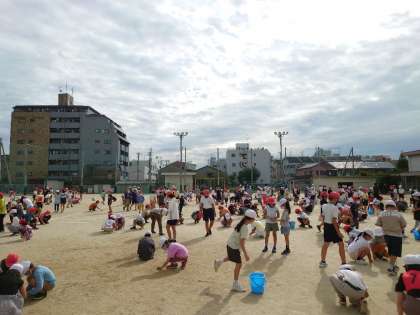 今日のにじいろ集会は、美化委員会を中心にして、運動会に向けて運動場の石ひろいを全校でしました。少しでも安全に運動会ができるように協力して小さな石もていねいに拾いました。美化委員会の人たちが拾った石を集めて処理してくれました。