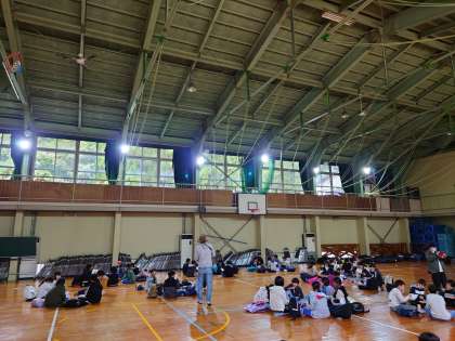 林間学習最後の食事です。高原で食べる予定でしたが、小雨がぱらついているので体育館で食べました。