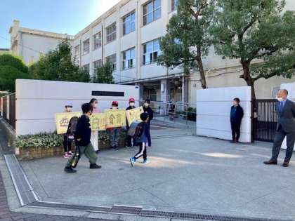 朝、給食委員会の児童が正門前に立ち、呼びかけを行いました。