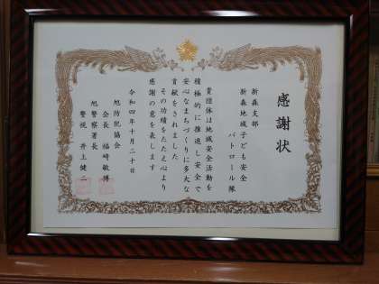 毎日の登下校をはじめ、新森小路小学校の子どもたちの安心・安全を見守ってくださっている地域子ども安全パトロール隊に、旭防犯協会、旭警察より感謝状が贈られましたので、ご報告いたします。