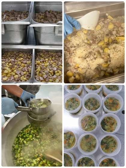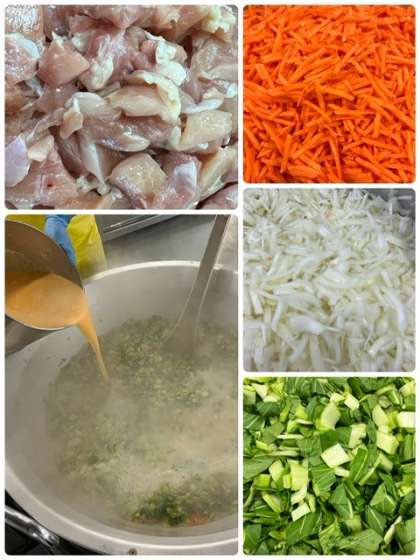 「卵スープ」は、鶏肉・にんじん・たまねぎ・チンゲンサイを使用した汁物です。液卵を流しいれる直前に除去食の児童の分を取り分け、専用の容器に入れて提供しました。