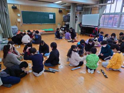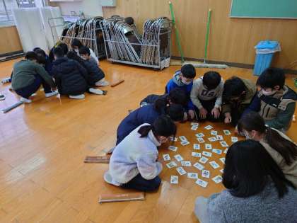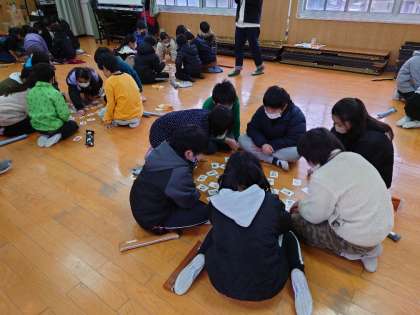 4年生が1・2組合同で、ことわざカルタに取り組んでいました。1枚とるごとに歓声があがるなど、とても楽しそうでした。楽しみながら一つでも多くことわざを覚えられたらいいですね。