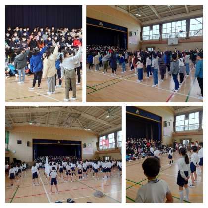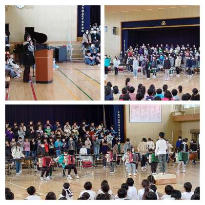 卒業を祝う会を実施しました。今年は、2部構成ですが2・4年が前半、1・3・5年が後半というかたちで6年生と対面して卒業をお祝いしました。各学年はお祝いの気持ちや感謝の気持ちを言葉や歌や合奏に乗せて伝えました。6年生からもお礼の気持ちをこめて歌と合奏が送られました。