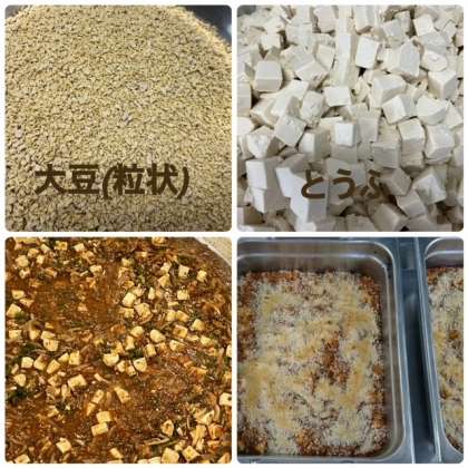「とうふのミートグラタン」は牛ひき肉・とうふ・大豆(粒状のもの)を主材に、たまねぎ・ピーマンを使用した、子どもたちにも人気のあるケチャップ味のグラタンです。