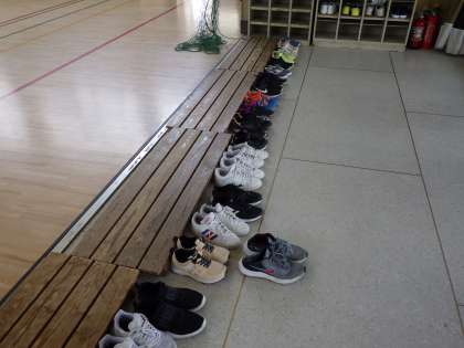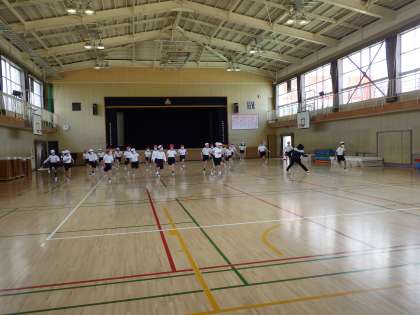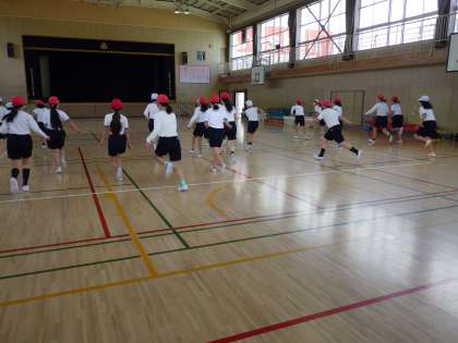 4月17日(月)6年生が体育館で体育の授業です。靴をそろえて脱いでいます。元気いっぱいです。