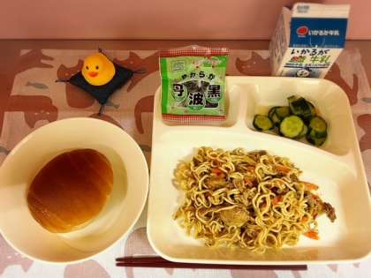 1年生の教室では、「おうちのとあじがちがう!」「やきそばのいろがうすい」などいろんな感想が飛び出しましたが、たくさんの児童がおかわりしていました😊