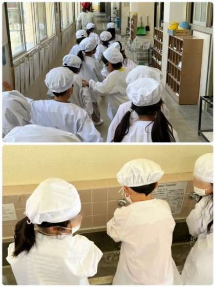 給食室前にある献立表は、給食委員会の児童が仕事の1つとして記入しています。1年生はじめ当番の児童が、ここを見て献立の確認をします^^