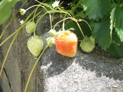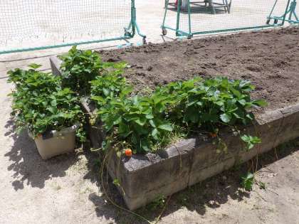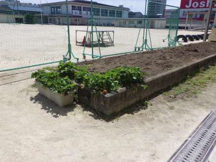 5月9日(火)朝からぽかぽかと温かい一日です。校庭西側の学習園にイチゴが実っています。子どもたちを暖かく見守っていま。