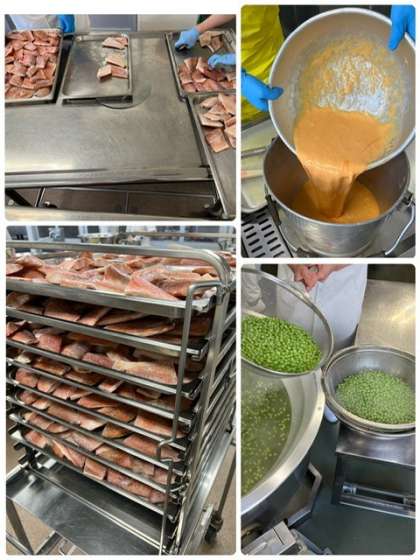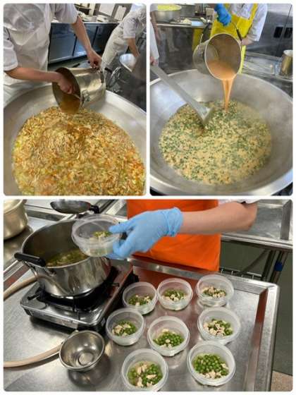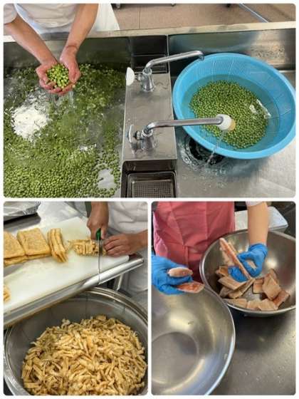 給食室で1つ1つさやから取り出した生のえんどうまめを、調理員さんがおいしく調理してくださいました。
