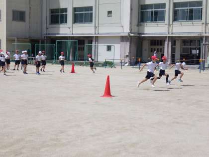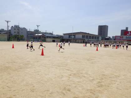 5月10日(水)4年生の体育、運動場で走る練習です。