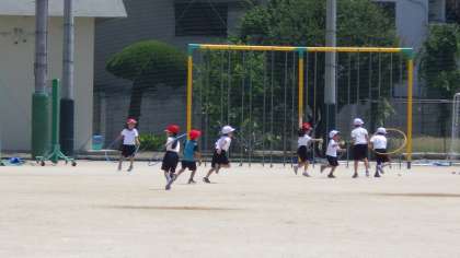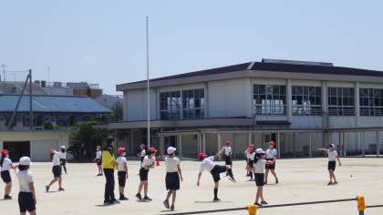5月16日(火)晴天の運動場で体育の授業をしています。6年生と1年生に様子です。