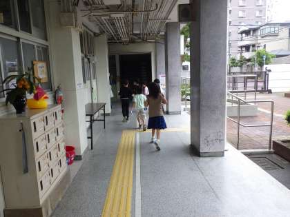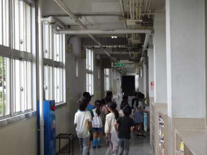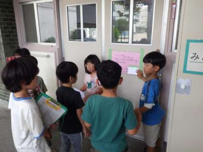 5月29日(月)班に分かれて2年生が1年生をリードして学校探検を行っています。