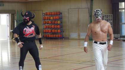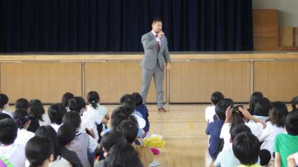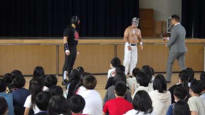6月16日(金)キャリア教育の一環として大阪プロレスのみなさんにお越しいただき子どもたちに「夢」に向かっての話をしていただきました。上の写真は社長のゼウスさん、中の写真の左はブラックバファローさん、右がタイガーズマスクさんです。