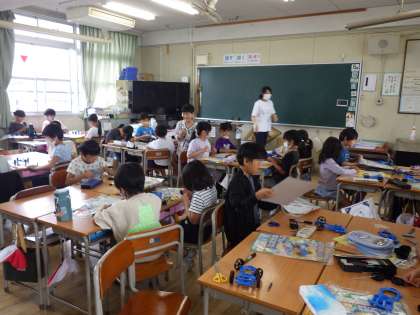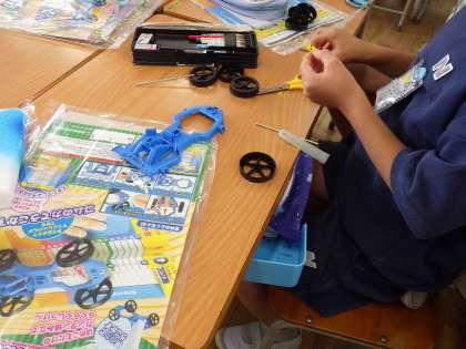 6月22日(木)3年生の理科、ゴムの力で動く車を作っています。