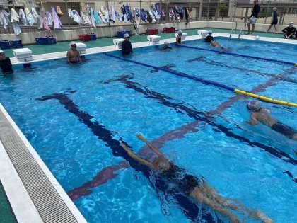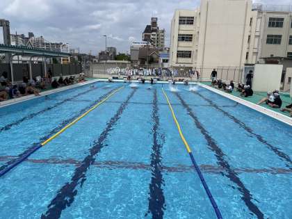 7月12日(水)5年生最後のプール学習でした。学習のまとめとして、水上運動会を開催しました。2競技は「水上走」、「けのび・バタ足」、「クロール」、「メドレー」、「宝探し」の5種目行いました。少し苦手な子から得意な子も自分の今年の学習の頑張りを存分に発揮していました。