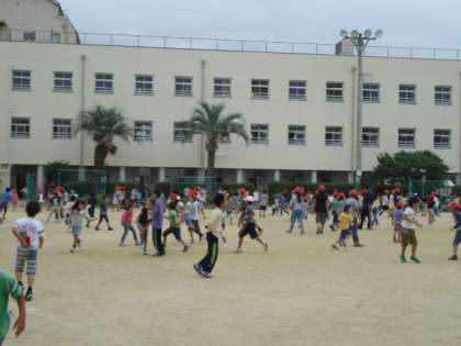 今回はしっぽとりゲームを全員で楽しみました。子どもたちの笑顔や歓声が運動場にあふれていました。