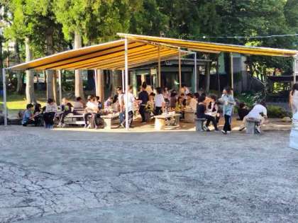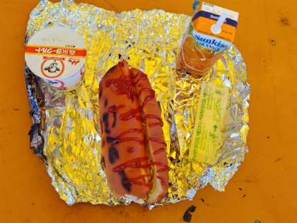 7月23日(日)朝ごはんのカートンドッグができました。す青空のもといただきます。天気は快晴、気温25℃。