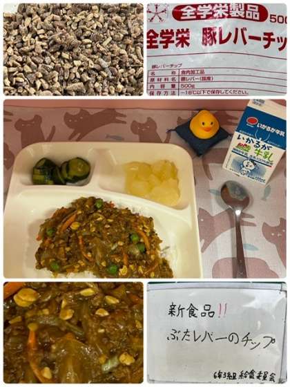 今日の大豆入りキーマカレーライスは、新食品の「豚レバー(チップ)」が使われています。レバーは少しクセのある食べものですが、細かくした豚レバーをひき肉と一緒に使うことで、食べやすくなるように工夫しています。