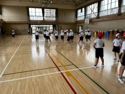 大きなソフトバレーボールを使って、ドッチボールをしました。後半はボール2個で行いました。元気いっぱい楽しみました。