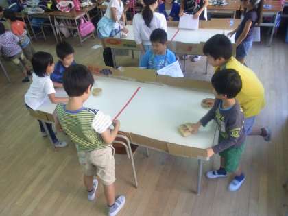 段ボールできたパックをマレットで打ち合います。