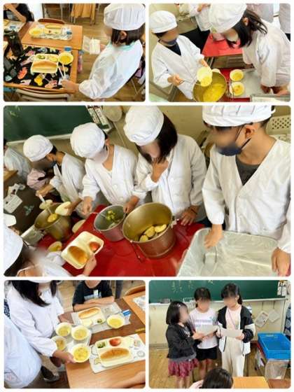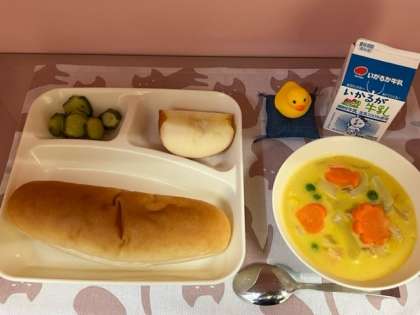 クリームシチューは、小麦アレルギーのある児童が食べられるように小麦粉の手作りルウの代わりに上新粉でとろみをつけ、また牛乳の代わりに豆乳を使用することで乳アレルギーのある児童も食べられるように工夫された献立でした。