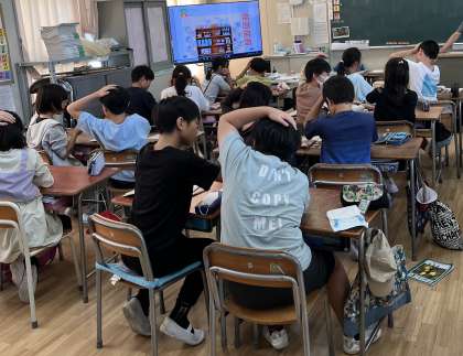 様々な文房具の英語の言い方を学習し、友だちとコミュニケーションをとる学習です。