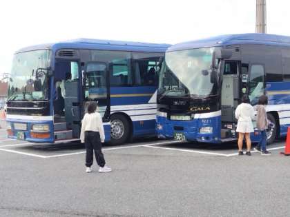10月16日(月)子ども達を乗せたバスは順調にはしっています。最初の休憩針テラスを出発しました。気温17℃、曇。薄日がさしてきました。子ども達は元気です。