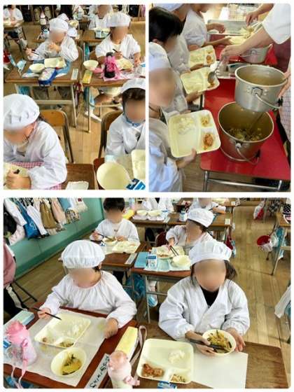 「焼き豚とワンタンの皮のスープ」は、焼き豚、ワンタンの皮、たっぷりの野菜を使用した、栄養満点の汁物でした。小麦製品のアレルギーのある児童には、ワンタンの皮を入れる直前のものを取り分けて提供しました。
