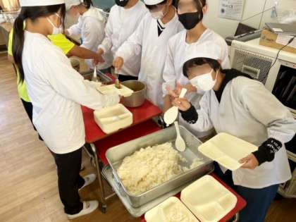 今日の給食も人気があり、6年生の教室でもおかわりの列ができていました。