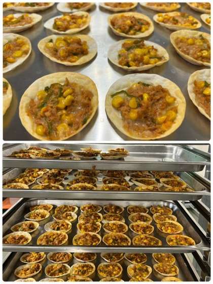 餃子の皮をピザ生地に見立て、ツナ・チーズ・ピーマン・コーン・ピザソースを混ぜ合わせた具をのせて焼き上げています。