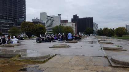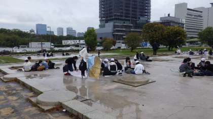 11月10日(金)6年生はピース大阪に遠足に行きました。雨でしたが元気に遠足に行きました。遠足の様子です。雨が上がり難波の宮跡でお弁当です。