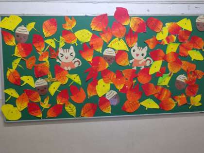 11月21日(火)1年生の掲示板にかわいいイラストと落ち葉です。