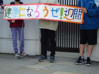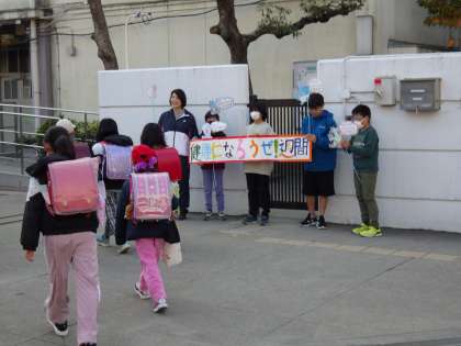 11月27日(月)今週は「健康になろうぜ}週間です。健康委員のみなさんが正門で呼びかけてくれています。