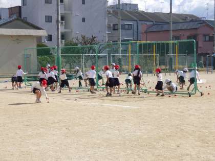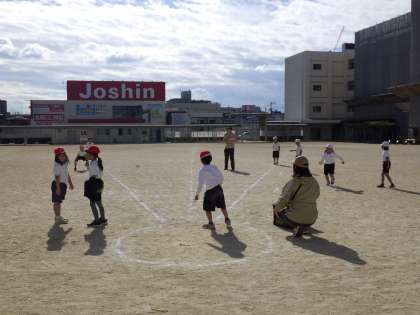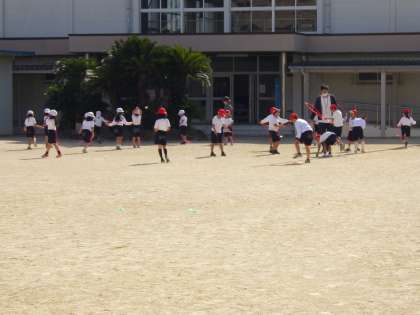 12月1日(金)1年生は運動場で体育です。ソフトボール投げを行っています。